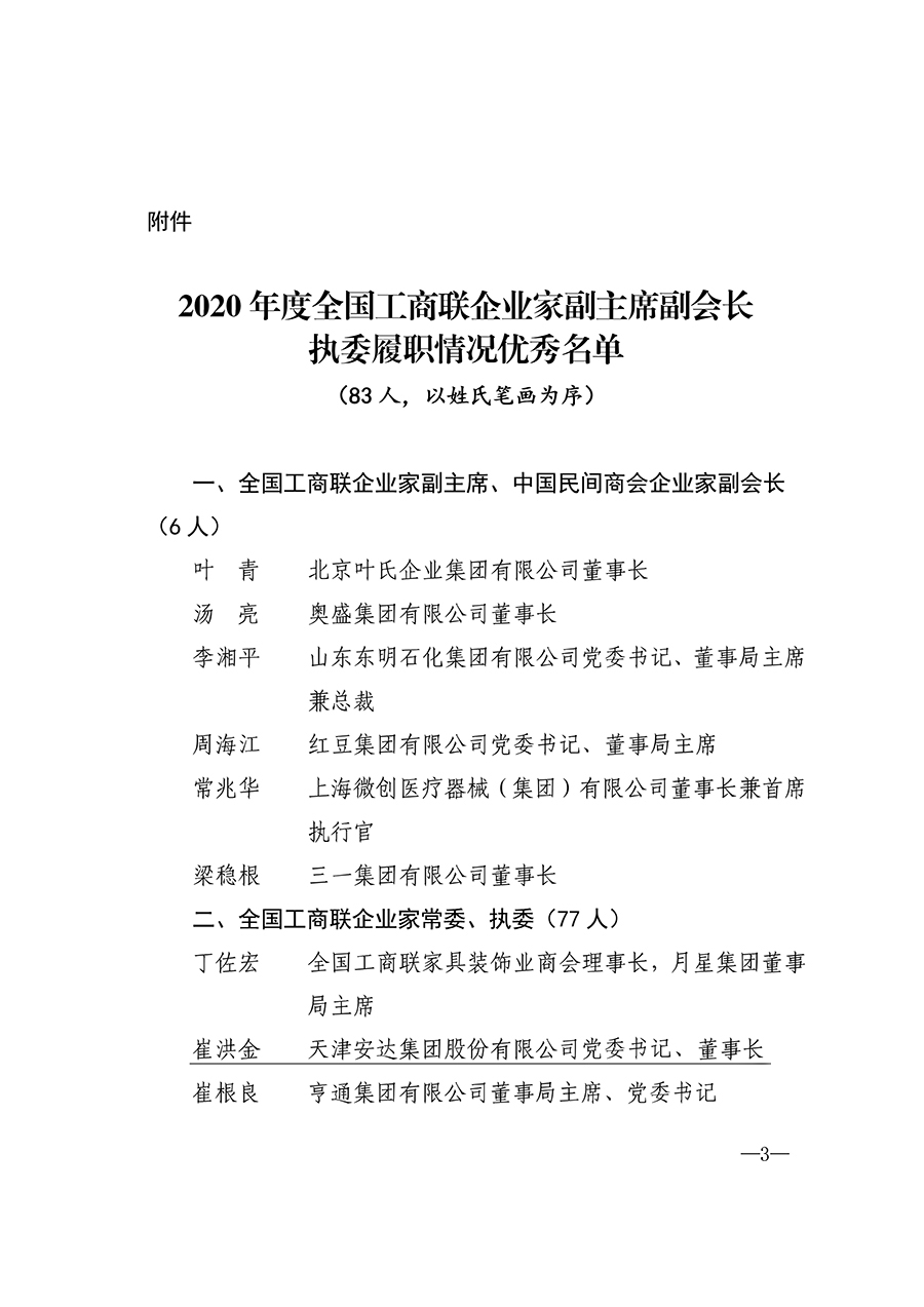 13日2021-09近日,全國(guó)工商聯(lián)發(fā)布《關(guān)于對(duì)2020年度履職情況優(yōu)秀的全國(guó)工商聯(lián)企業(yè)家副主席副會(huì)長(zhǎng)執(zhí)委給予表?yè)P(yáng)的通報(bào)》?!锻▓?bào)》指出,2020年度面對(duì)突如其來(lái)的新冠肺炎疫情沖擊影響,各位企業(yè)家副主席、副會(huì)長(zhǎng)、執(zhí)委認(rèn)真學(xué)習(xí)貫徹習(xí)近平新時(shí)代中國(guó)特色社會(huì)主義思想,以實(shí)際行動(dòng)響應(yīng)中央號(hào)召,積極投身抗擊疫情狙擊戰(zhàn),...[查看詳情]