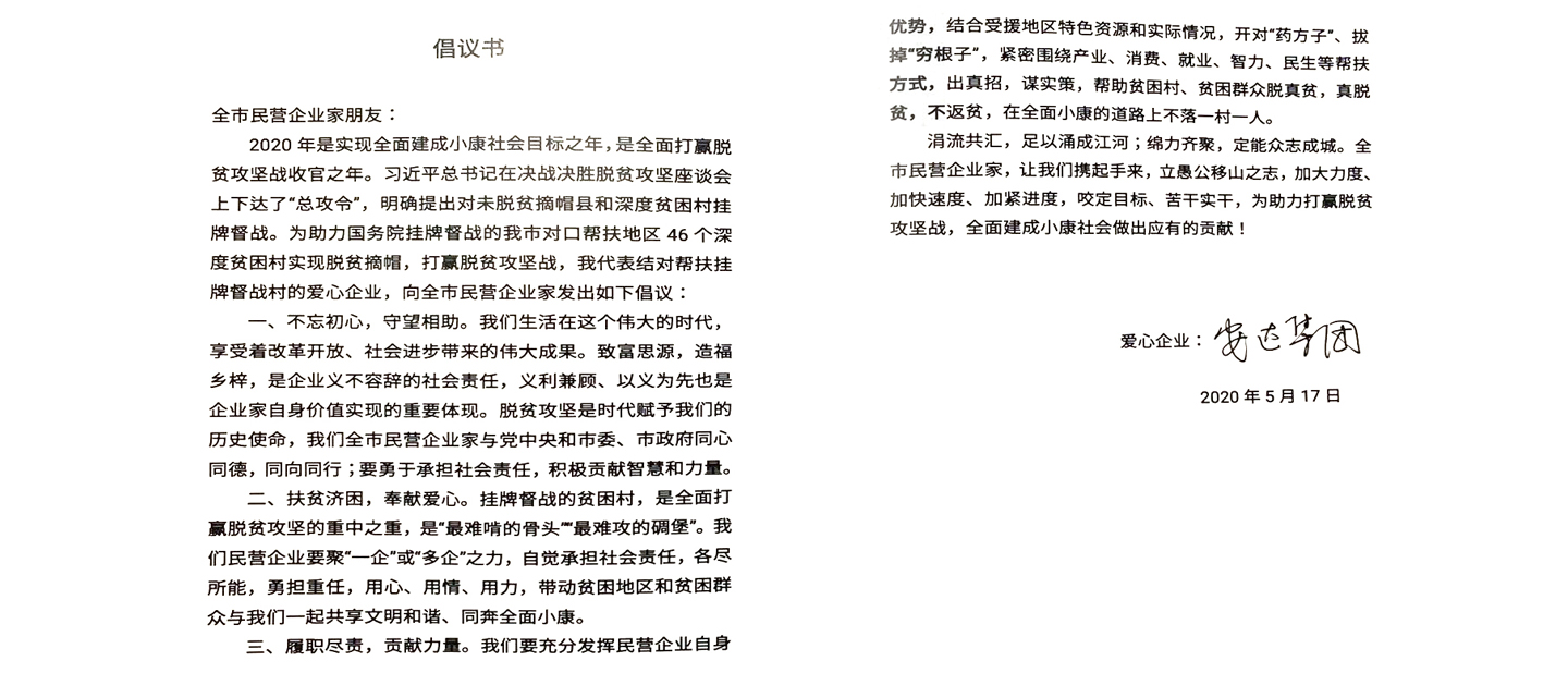啟動(dòng)儀式上,天津愛心企業(yè)以“云聚力”方式發(fā)出助力貧困村摘帽行動(dòng)倡議書,16個(gè)區(qū)200余家企業(yè)進(jìn)行“云簽約”。安達(dá)集團(tuán)作為一家擁有32年歷史的優(yōu)秀企業(yè),在黨委書記、董事長(zhǎng)崔洪金的帶領(lǐng)下,長(zhǎng)期堅(jiān)持慈善公益活動(dòng),近年來,響應(yīng)政府號(hào)召,特別關(guān)注脫貧攻堅(jiān)助困工作,通過捐資捐款、購買扶貧產(chǎn)品等方式助力脫貧攻堅(jiān)工作,今后安達(dá)集團(tuán)還將繼續(xù)發(fā)揮民營(yíng)企業(yè)自身優(yōu)勢(shì),緊密圍繞產(chǎn)業(yè)、消費(fèi)、就業(yè)、民生等幫扶方式,助力貧困村、貧困群眾真脫貧。