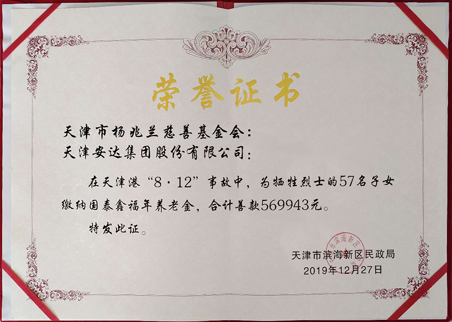 2015年天津市楊兆蘭慈善基金會、天津安達(dá)集團捐款,為在天津港“8.12”事故中,不幸犧牲烈士的57名子女通過人保繳納國泰鑫福年養(yǎng)老金,合計57萬余元。對于安達(dá)集團崔洪金董事長的這份暖心善舉,濱海新區(qū)慈善協(xié)會會長張傳捷攜濱海新區(qū)民政局相關(guān)領(lǐng)導(dǎo)親自登門感謝,將這份沉甸甸的獎狀送到崔洪金手里,以示表揚和鼓勵。