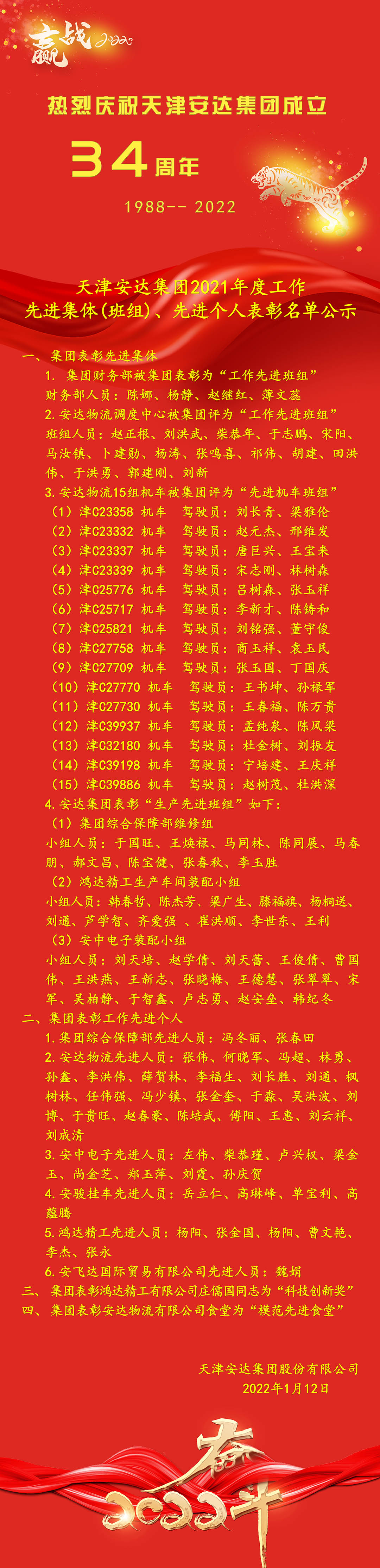 現(xiàn)將表彰的先進(jìn)集體和先進(jìn)個(gè)人進(jìn)行公示,望所有受表彰人員能夠再接再勵(lì),再創(chuàng)佳績。展望2022年,將是強(qiáng)化改革、戰(zhàn)勝疫情的轉(zhuǎn)折之年,更是夯實(shí)基礎(chǔ)、強(qiáng)力發(fā)展的關(guān)鍵之年。安達(dá)集團(tuán)將面臨機(jī)遇,迎接挑戰(zhàn),希望廣大黨員和職工群眾團(tuán)結(jié)一致、緊抓機(jī)遇,激勵(lì)斗志、提高效益,結(jié)合國家發(fā)展戰(zhàn)略,促進(jìn)企業(yè)穩(wěn)步發(fā)展。