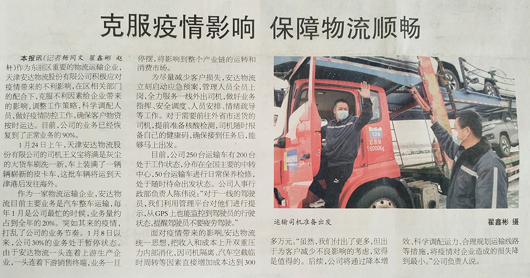 作為一家物流運輸企業(yè),安達物流目前主要業(yè)務(wù)是汽車整車運輸,每年1月是公司最忙的時候,業(yè)務(wù)量約占到全年的20%。突如其來的疫情,打亂了公司的業(yè)務(wù)節(jié)奏。1月8日以來,公司30%的業(yè)務(wù)處于暫停狀態(tài)。由于安達物流一頭連著上游生產(chǎn)企業(yè),一頭連著下游銷售終端,業(yè)務(wù)一旦停擺,將影響到整個產(chǎn)業(yè)鏈的運轉(zhuǎn)和消費市場。