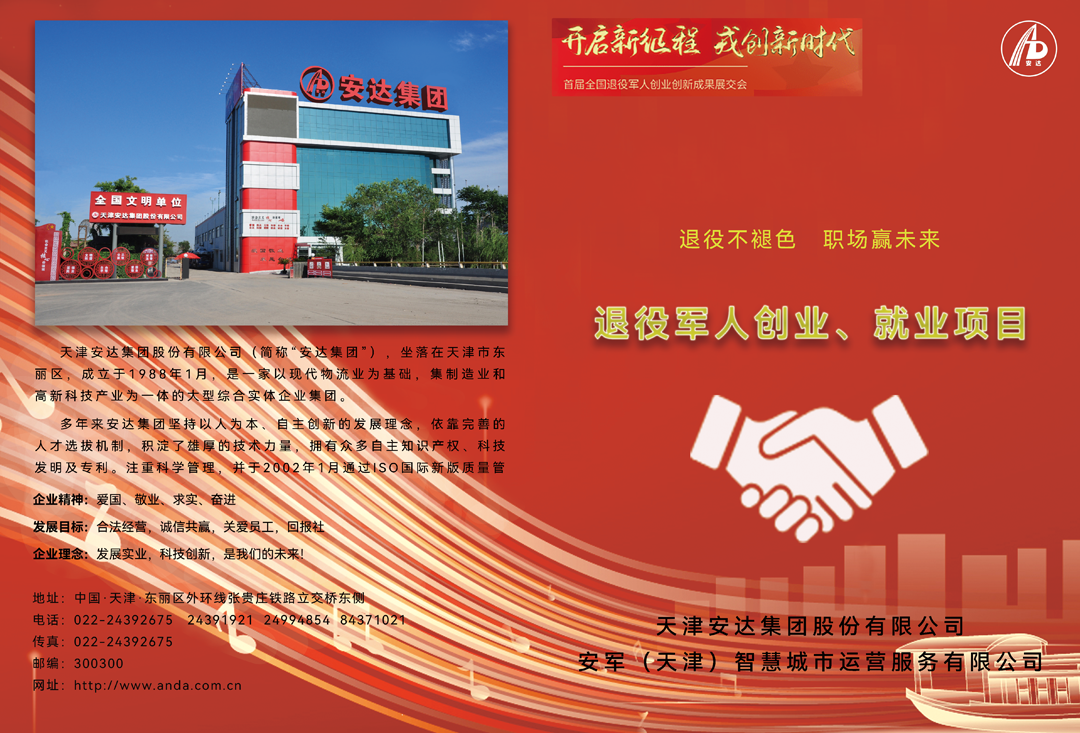 天津安達集團旗下子公司安軍(天津)智慧城市運營服務(wù)有限公司是一家致力于為專業(yè)從事智慧城市科技產(chǎn)品的銷售、智慧城市設(shè)施的運營與服務(wù)的高科技公司,為認真貫徹習(xí)近平總書記關(guān)于“讓軍人成為全社會尊崇的職業(yè)”的指示精神,更好地配合國務(wù)院退役軍人事務(wù)部開展退役軍人創(chuàng)業(yè)和就業(yè)工作,安達集團以自有的廚余垃圾生化處理設(shè)備、機動車和非機動車停車管理系統(tǒng)為內(nèi)容搭建安達退役軍人創(chuàng)業(yè)就業(yè)平臺,為全國退役軍人提供項目合作機會,誠摯邀請合伙人加盟項目,共創(chuàng)廚余垃圾就地資源化處理、城市機動車和非機動車的停車管理服務(wù)等項目的民生大業(yè)。