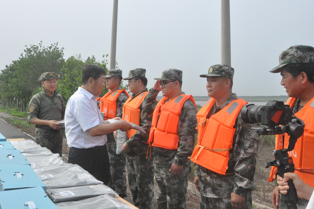 崔洪金現(xiàn)場了解民兵生活、排險情況,向堅守河堤的民兵表示崇高敬意,并為民兵送上夏季訓(xùn)練服裝和防暑降溫慰問品,對他們發(fā)揚“聞‘汛’而動、聽令而行、勇于奉獻”的精神高度贊揚。