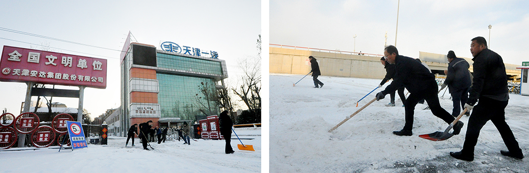 12月14日,降雪覆蓋了津城大地。翩然而至的冬雪為城市平添了幾分浪漫與詩意,雪景雖美,但也為人們的出行和工作帶來諸多不便。為保障員工們安全出行,15日一大早,安達集團本部及各子公司廠院內(nèi),各單位員工在相關領導帶領下,手拿鐵鍬、掃帚、簸箕等工具,對辦公樓門口和廠區(qū)內(nèi)重要點位進行積雪大清掃。在襲襲寒風中,大家頂風除雪,不畏嚴寒,“浴”雪奮戰(zhàn),一派熱火朝天的景象。