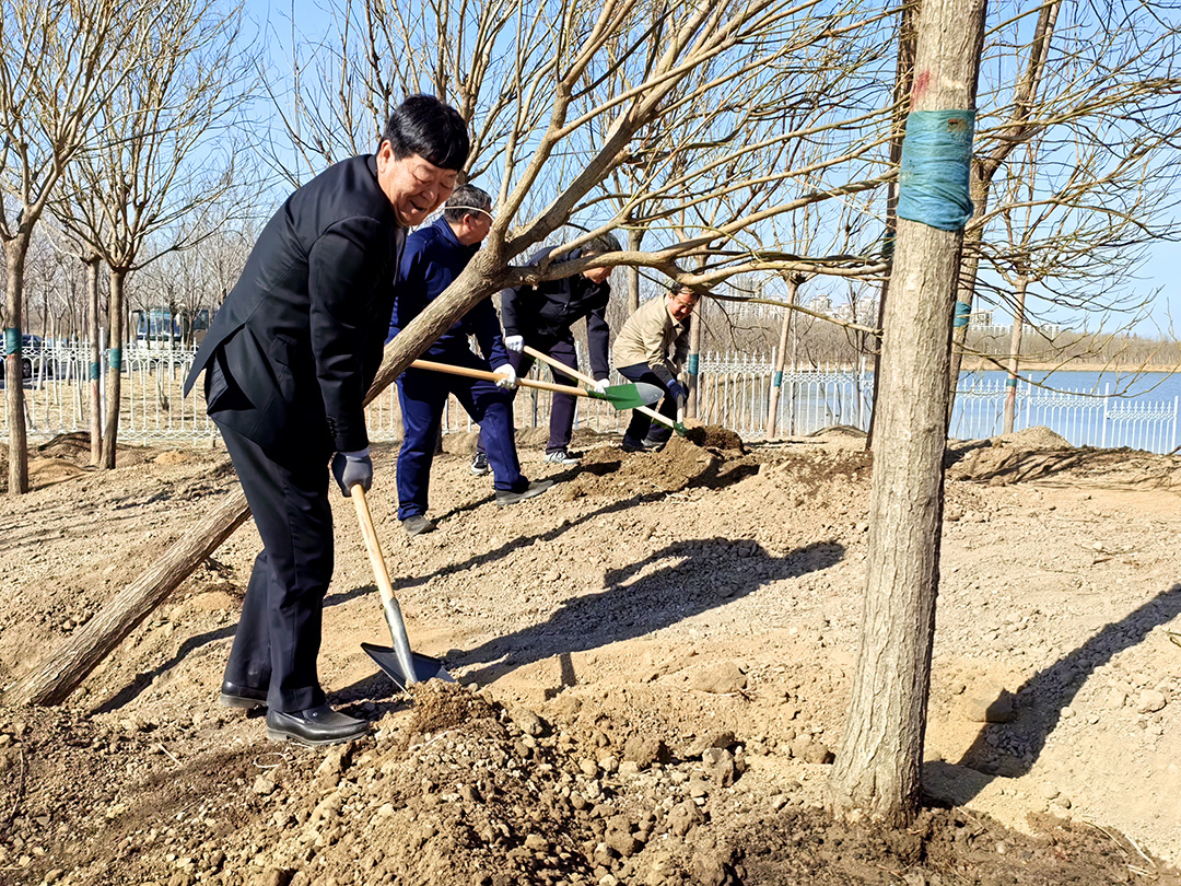東湖風(fēng)景區(qū)位于綠色生態(tài)屏障區(qū)內(nèi),風(fēng)景區(qū)內(nèi)湖面蕩漾,林水相依,草長鶯飛,成為市民游憩休閑、親近自然的好去處。趙飛、賈堤、李春、李大勇、劉偉、崔洪金等來到這里,拿起鐵鍬來到植樹區(qū)域,揮鍬鏟土、培土圍堰、提桶澆水,種下北京欒、旱柳等苗木。新種下的樹木迎風(fēng)挺立,一排排矗立在岸邊,枝條在春風(fēng)的吹拂下輕輕搖曳,充滿勃勃生機(jī)。