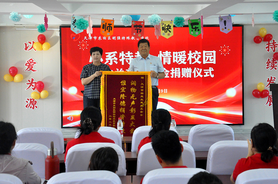 隨后的捐贈儀式上,崔洪金代表天津市楊兆蘭慈善基金會,將 10 萬元教師專項(xiàng)改善資金交付明強(qiáng)特殊教育學(xué)校校長尚俊歆手上。尚校長表示該筆資金將精準(zhǔn)用于教師發(fā)展基金,支持教師參與特教專業(yè)培訓(xùn)、教研交流活動,為教師成長賦能。為表感謝,尚校長向崔洪金董事長贈送錦旗。