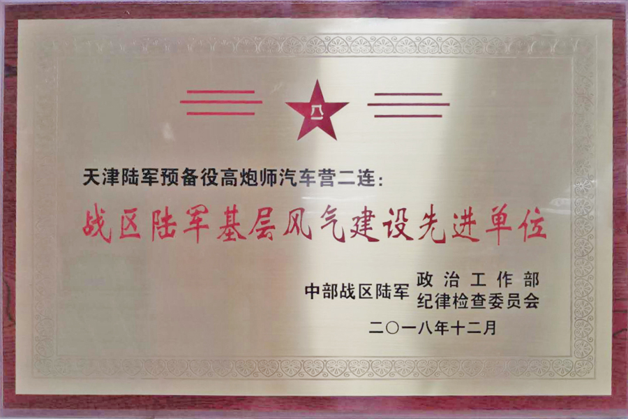 同時,為表彰預備役高炮師汽車營二連日??炭嘤柧殻瑖烂C風紀,積極承當各項任務。中部戰(zhàn)區(qū)陸軍政治工作部、紀律檢查委員會,特授予天津陸軍預備役汽車營二連“戰(zhàn)區(qū)陸軍基層風氣建設先進單位”稱號。